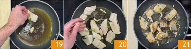 Dans une grande poêle, chauffez un filet d'huile avec une gousse d'ail en chemise, puis déposez les morceaux de turbot côté peau vers le bas 19. Faites cuire à feu vif pendant un maximum de 5 minutes jusqu'à ce que la peau devienne croustillante, puis retournez-les de l'autre côté 20, éteignez le feu et laissez-les dans la poêle pendant encore deux minutes 21.