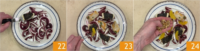 Vous êtes prêts à dresser : répartissez le radicchio à la base de l'assiette, puis ajoutez le turbot 22 et les quartiers d'orange pelés à vif 23. Saupoudrez de brisures de noix 24.