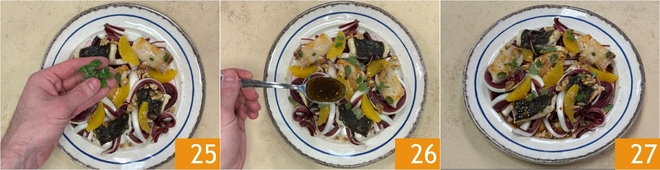 Garnissez de quelques feuilles de marjolaine 25 et assaisonnez avec l'émulsion aux agrumes 26. Le turbot à la poêle avec salade d'oranges, radicchio et noix est prêt à être servi 27 !