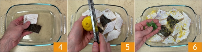 Transférez les morceaux de poisson dans un plat 4 et parfumez avec le zeste de citron 5 et les feuilles de marjolaine 6.
