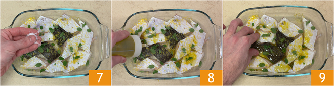 Assaisonnez avec du sel 7 et de l'huile 8, puis massez délicatement avec les mains pour bien imprégner le poisson 9. Laissez reposer au réfrigérateur pendant 15 minutes.
