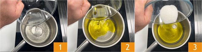 Pour préparer les turdilli calabrais, commencez par verser dans une petite casserole l'eau, le vermouth 1, l'huile 2 et le sucre 3. Chauffez jusqu'à ce que tout le sucre soit dissous. Puis laissez tiédir.