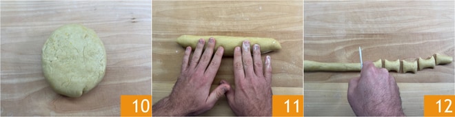 Vous devez obtenir une pâte lisse et homogène 10. Divisez-la en deux et formez des boudins 11 d'un diamètre de 2 cm. Coupez-les ensuite en morceaux de 5 cm de long 12.