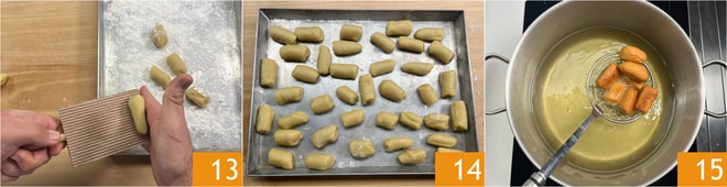 Passez chaque morceau sur un guillocheur 13, ou sur les dents d'une fourchette, en appuyant légèrement pour obtenir les stries caractéristiques du dessert. Si nécessaire, utilisez un peu de farine. Disposez progressivement les turdilli sur un plateau saupoudré de farine 14. Portez l'huile de tournesol à une température de 180°C. Si vous n'avez pas de thermomètre de cuisine, vous pouvez plonger un bâtonnet en bois dans l'huile. Si des bulles se forment autour, l'huile est à la bonne température. Faites frire les turdilli par petites quantités, pour ne pas trop abaisser la température de l'huile, jusqu'à ce qu'ils soient dorés 15.