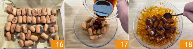 Égouttez-les et déposez-les sur du papier absorbant 16 pour éliminer l'excès d'huile. Une fois la friture terminée, transférez immédiatement les turdilli encore chauds dans un bol, versez le miel de figues 17 et mélangez bien 18, pour que chaque petit gâteau soit complètement enrobé.