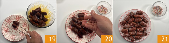 Transférez-les ensuite sur un plat de service 19 et décorez avec des perles de sucre colorées 20. Vos turdilli calabrais sont prêts à être dégustés 21 !