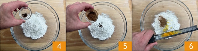 Entre-temps, mettez la farine dans un bol, ajoutez les clous de girofle moulus 4, la cannelle en poudre 5 et le zeste d'orange râpé 6. Mélangez et créez un puits au centre de la farine.