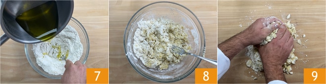 Versez les liquides petit à petit dans la farine, tout en mélangeant avec une fourchette 7 8. Transférez le tout sur un plan de travail et continuez à pétrir avec les mains 9.