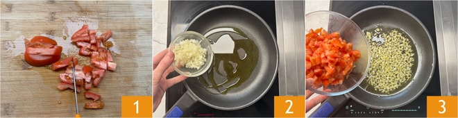 Pour préparer les œufs à la tomate, commencez par couper les tomates cerises en cubes de 1 cm 1. Dans une poêle antiadhésive, versez un filet d'huile, ajoutez l'oignon finement haché 2 et faites revenir pendant 5 minutes, jusqu'à ce que les oignons soient tendres et translucides. Ajoutez les tomates 3.