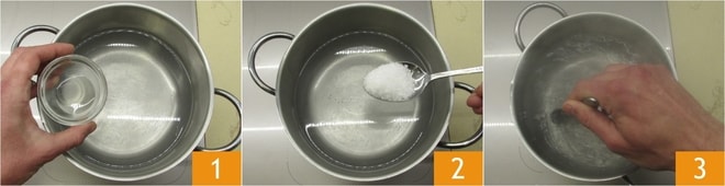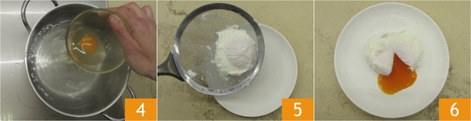 Pour préparer les œufs pochés, remplissez une grande casserole d'eau en laissant 4-5 cm du bord. Allumez à feu moyen, puis ajoutez le vinaigre de vin blanc 1 et le gros sel 2. Lorsque le sel est dissous et que l'eau commence à frémir légèrement (elle ne doit pas bouillir avec véhémence), baissez le feu et, à l'aide d'une cuillère, remuez toujours dans le même sens pour créer un tourbillon dans l'eau 3.