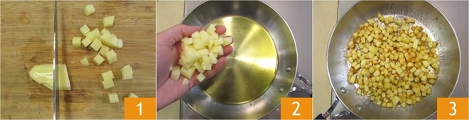 Pour préparer les œufs à la flamenca, commencez par éplucher les pommes de terre et les couper en dés d'environ un demi-centimètre 1. Faites chauffer l'huile pour couvrir le fond d'une poêle, ajoutez les pommes de terre 2 et faites-les dorer à feu vif jusqu'à ce qu'elles soient dorées 3.