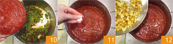 Versez également la purée de tomates 10, salez 11, poivrez et faites cuire à feu moyen pendant environ 30 minutes, avec le couvercle. Après ce temps, ajoutez les pommes de terre 12.