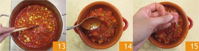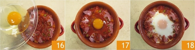 Mélangez bien 13 et éteignez le feu. À ce stade, répartissez la sauce dans 4 cocottes 14 et ajoutez-y le jamon serrano, en le déchirant avec les mains 15.