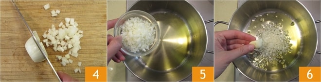 Entre-temps, épluchez et hachez l'oignon 4, puis faites-le revenir avec un filet d'huile dans une autre poêle 5 avec la gousse d'ail 6.