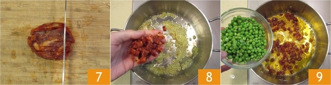 Pendant ce temps, coupez le chorizo en tranches et réduisez-le en dés 7. Quand l'oignon est fondu, ajoutez le chorizo 8 et faites revenir pendant 5 minutes supplémentaires, puis ajoutez les petits pois 9.