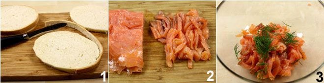 Pour préparer les œufs en cocotte avec saumon fumé, commencez par enlever la croûte des tranches de pain avec un couteau, 1 badigeonnez-les légèrement avec de l'huile d'olive extra-vierge et mettez-les au four à griller, en mode grill pendant quelques minutes, en les retournant pendant la cuisson. Pendant ce temps, coupez le saumon fumé en fines lanières 2 et mettez-le dans un bol, ajoutez les brins d'aneth 3
