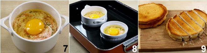 Placez un œuf (en faisant attention à ne pas le casser) sur chaque cocotte 7. À ce stade, remplissez une plaque de cuisson d'eau bouillante jusqu'à mi-hauteur, placez-y les cocottes 8 et enfournez à 180°C pendant 15 minutes. Garnissez de poivre moulu, de petites feuilles d'aneth et servez les œufs en cocotte avec saumon accompagnés des tranches de pain grillé coupées en bâtonnets 9.
