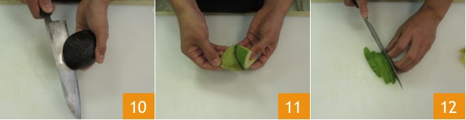 divisez-le en deux en l'incisant dans le sens de la longueur avec un couteau 10, séparez les deux moitiés et prenez-en une. Épluchez-la délicatement avec les mains 11, placez-la sur une planche à découper et coupez-la en quartiers 12. Pour chaque rouleau, il faudra environ 20 g.