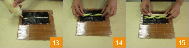 Étalez une bande de mayonnaise au centre de l'algue, en utilisant un biberon de cuisine pour un résultat plus précis 13. Placez sur la mayonnaise deux quartiers d'avocat, l'un à la suite de l'autre 14, de manière à remplir toute la longueur de l'algue. À côté, vers vous, ajoutez la chair de crabe (king crab) 15, vous devrez laisser environ 2-3 cm entre les ingrédients et le bord de la feuille.