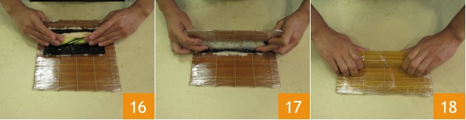 Avec les deux mains, soulevez le bord du tapis le plus proche de vous et commencez à rouler. Appliquez une légère pression avec les doigts, en poussant les ingrédients vers l'intérieur 16, soulevez à nouveau le tapis 17 et terminez de rouler le rouleau. Effectuez la pression habituelle 18.