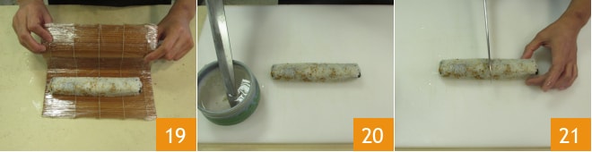 puis ouvrez le tapis 19 et transférez l'uramaki sur une planche à découper. Humidifiez la lame d'un couteau avec de l'eau simple pour ne pas abîmer le fil du couteau 20. Coupez le rouleau en deux 21,