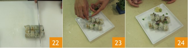 puis placez les 2 pièces obtenues côte à côte et coupez-les en 4 parties égales pour obtenir 8 pièces 22. Transférez-les sur un plat de service et servez vos uramaki, décorés de pousses, de petites feuilles de salade et de tranches de radis 23. Vos uramaki sont prêts, servez-les avec du wasabi et du gingembre mariné 27.