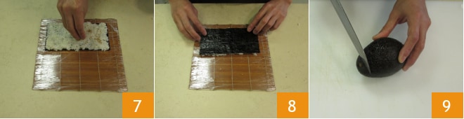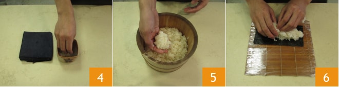 Humidifiez vos mains avec de l'eau acidulée 4 et prenez 120 g de riz désormais tiède 5. Étalez-le en le pressant avec le bout des doigts 6 et en le déplaçant uniformément sur toute la surface de l'algue nori. L'épaisseur du riz ne doit pas être très élevée. Aidez-vous en humidifiant vos mains avec l'eau acidulée. Avec l'expérience, vous comprendrez combien il en faut : si c'est trop, le riz glissera des mains, si c'est trop peu, il restera collé.