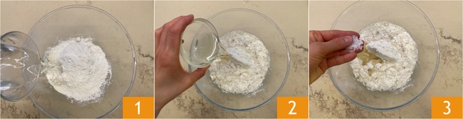 Pour préparer les vareniki avec des cerises, commencez par la pâte : dans un bol, mettez la farine tamisée, puis ajoutez l’eau tiède 1, l'huile de tournesol 2 et une pincée de sel 3.