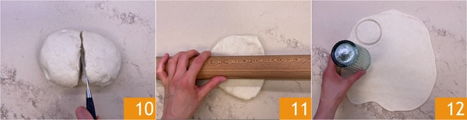 Maintenant, reprenez la pâte et divisez-la en deux 10. Étalez les deux parties avec un rouleau à pâtisserie pour obtenir 2 feuilles d'environ 2 mm d'épaisseur 11. Avec un verre ou un emporte-pièce, découpez des disques d’environ 7,5 cm de diamètre 12.