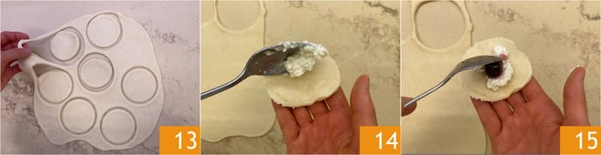 Éliminez l'excédent de pâte 13 qui peut être pétri à nouveau pour obtenir d'autres disques. Garnissez les disques avec une cuillère de garniture 14 et une cerise au sirop 15.