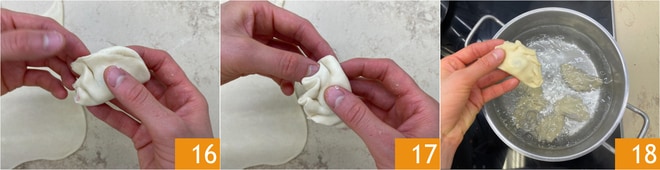 Repliez les disques en deux et fermez-les en demi-lune, en pinçant les bords pour les sceller 16 17. Faites cuire les raviolis obtenus dans de l'eau bouillante à laquelle vous aurez ajouté une pincée de sel 18. Pendant ce temps, faites fondre le beurre et versez-le dans un bol.