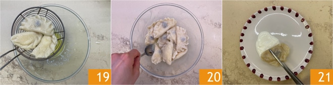 Égouttez les vareniki lorsqu'ils remontent à la surface, cela prendra environ 3-4 minutes, puis transférez-les directement dans le bol avec le beurre fondu 19. Mélangez pour bien les enrober avec le condiment 20. Versez une cuillère de crème fraîche sur les assiettes de service et déposez les vareniki par-dessus 21.