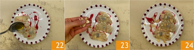 Arrosez-les avec le liquide des cerises au sirop et le miel 22. Enfin, garnissez avec des éclats d'amandes 23. Vos vareniki avec des cerises sont prêts à être servis 24 !