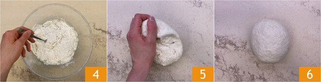 Travaillez d'abord avec une fourchette 4, puis déplacez-vous sur le plan de travail et pétrissez avec les mains 5 jusqu'à obtenir une pâte lisse et homogène 6. Si la pâte est trop collante, vous pouvez ajouter un peu de farine. Couvrez avec un film plastique et laissez reposer pendant 10 minutes à température ambiante.