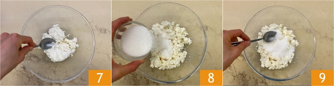 En attendant, occupez-vous de la garniture : dans un bol, mettez le tworog et écrasez-le avec une cuillère ou une fourchette 7, puis ajoutez le sucre 8 et mélangez 9. Goûtez pour ajuster la douceur selon votre goût.
