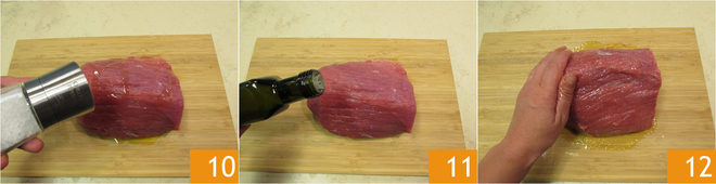 Pour la viande, prenez le morceau de noix de veau (ou rond de gîte) : salez 10, arrosez d'huile 11 et massez tout le morceau de viande 12.