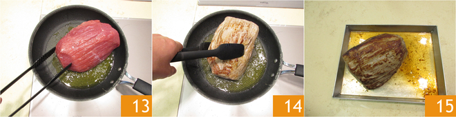 Avant la cuisson au four, la viande doit être saisie dans une poêle déjà chaude avec un filet d'huile pour la sceller 13 14 : cela fera en sorte que les jus restent à l'intérieur et que la viande soit très tendre même après la cuisson au four. Ensuite, mettez au four à 135° (four statique préchauffé), pendant 20-25 minutes (pour le kg de viande que nous avons utilisé). La température au cœur doit être de 59°.