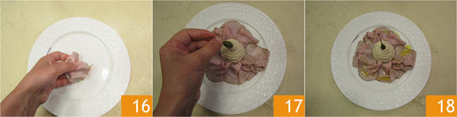 C'est l'heure de dresser : coupez la viande en très fines tranches, disposez-les sur le plat de service 16, puis assaisonnez avec la sauce tonnata, un câpre fleur 17 et votre veau tonnato avec mayonnaise 18.