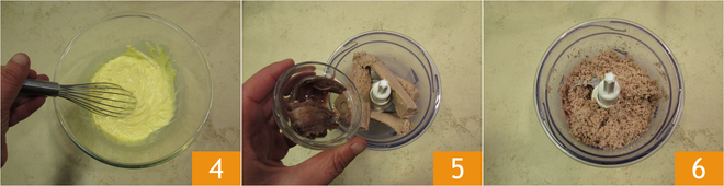 Enfin, ajoutez la moutarde et mélangez avec le fouet pour obtenir une consistance crémeuse et homogène 4. Mettez de côté et passez à la préparation de la sauce tonnata : mixez ensemble le thon rouge de Sicile à l'huile égoutté, les anchois du Cantabrique 5, les câpres dessalées, jusqu'à obtenir un mélange homogène 6.