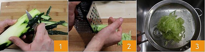 Pour préparer les wraps veggie, commencez par préparer la sauce tzatziki : lavez le concombre et avec un petit couteau, enlevez la peau jusqu'à obtenir toute la surface blanche 1. Râpez le concombre avec la râpe à gros trous 2, puis passez la pulpe dans une passoire, pressez-la pour bien l'égoutter du liquide de végétation 3.