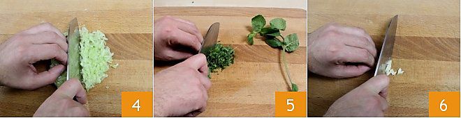 Hachez ensuite le concombre au couteau pour obtenir une pulpe encore plus fine 4. Lavez la menthe fraîche et hachez finement les feuilles 5, enfin hachez la demi-gousse d'ail 6.