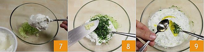 Dans un bol, versez le concombre haché, ajoutez le yaourt grec et mélangez 7. Ajoutez ensuite la menthe et l'ail hachés 8, le sel, l'huile et le vinaigre 9. Mélangez soigneusement tous les ingrédients pour obtenir un mélange homogène. Laissez reposer au réfrigérateur pendant une demi-heure la sauce couverte de film plastique.