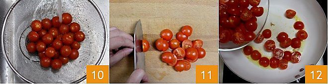 Passez maintenant à la cuisson des tomates cerises caramélisées : rincez bien les tomates sous l'eau courante et coupez-les en deux 11. Dans une poêle, faites revenir la demi-gousse d'ail avec l'huile. Lorsqu'il sera doré, ajoutez les tomates et faites-les sauter pendant 2 minutes à feu moyen 12.