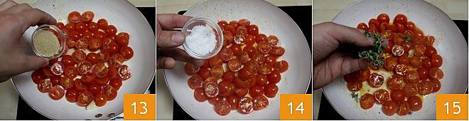 Ajoutez aux tomates dans la poêle le sucre de canne 13, le sel 14 et le thym effeuillé à la main 15. Laissez les tomates fondre à feu doux pendant une dizaine de minutes ou jusqu'à ce qu'elles perdent presque toute leur partie aqueuse, puis éteignez le feu. Vous pouvez remplacer les tomates caramélisées par des tomates confites (pour la recette cliquez aussi ici).