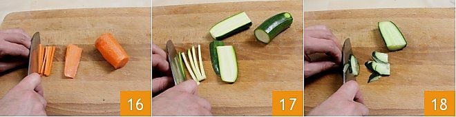 Poursuivez la préparation des wraps en préparant les autres légumes pour la garniture. Pour la découpe des légumes, vous pouvez consulter la fiche École de cuisine : comment couper les légumes. Commencez par laver soigneusement tous les légumes et la salade mesclun. Épluchez les carottes et coupez-les finement en julienne 16. Continuez avec les courgettes sans les deux extrémités 17, tandis que le concombre avec toute la peau, ou sans si vous préférez, devra être coupé d'abord en deux puis en fines tranches diagonales 18.