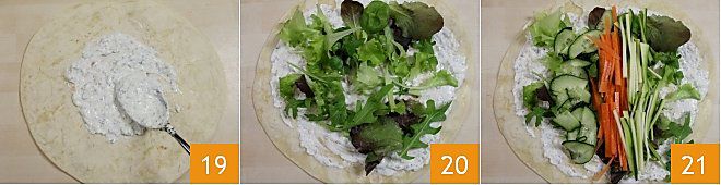 Faites chauffer à feu doux le fond d'une poêle antiadhésive et placez les galettes sans saindoux d'un côté, en les chauffant pendant quelques secondes pour qu'elles ne sèchent pas. Ensuite, retirez-les du feu et étalez-les du côté chauffé avec une bonne quantité de sauce tzatziki 19. Commencez ensuite à garnir, en plaçant au centre de chaque galette le mesclun (environ 12 g), les concombres (environ 40 g), les courgettes (environ 30 g) et les carottes (environ 40 g) comme illustré sur les photos (20-21).