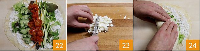 Ajoutez 80 g de tomates cerises caramélisées sur chaque galette 22. Une fois les légumes terminés, passez à la découpe de la feta en dés d'un demi-centimètre 23 et ajoutez-en 25 g pour chaque galette. Roulez les galettes pour créer vos wraps, en veillant à ce que les ingrédients ne s'échappent pas 24.