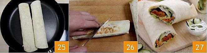 Dans une poêle antiadhésive préalablement chauffée à feu doux, faites chauffer pendant quelques secondes et sur tous les côtés les wraps obtenus 25. Puis retirez-les du feu. Pour savourer plus facilement les wraps veggie, vous pouvez les couper en deux en diagonale 26 et les servir à votre guise avec encore un peu de sauce tzatziki à part 27.