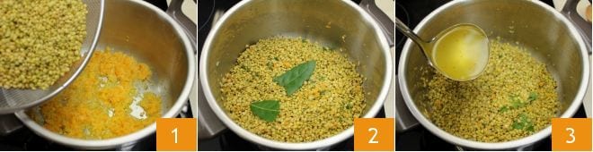 Pour préparer la velouté de lentilles en croûte, faites tremper les lentilles avec une demi-cuillère à café de bicarbonate la veille ou 2-3 heures avant l'utilisation, en veillant à changer l'eau au moins une fois. Puis rincez-les et égouttez-les. Épluchez et hachez finement l'oignon, la carotte et le céleri, et faites-les revenir à feu doux pendant au moins 10 minutes dans l'huile et le beurre. Ajoutez les lentilles 1, mélangez, ajoutez le laurier 2, les feuilles de thym frais et couvrez le tout avec le bouillon de légumes 3.