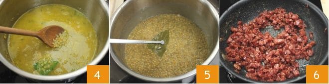 Faites cuire les lentilles jusqu'à ce qu'elles deviennent tendres, en ajoutant du bouillon si nécessaire 4, puis salez et poivrez. Une fois les lentilles cuites, retirez la feuille de laurier 5. Pendant que les lentilles cuisent, prenez le cotechino déjà cuit, émiettez-le dans une poêle et faites-le devenir croustillant à feu doux, en remuant de temps en temps 6.